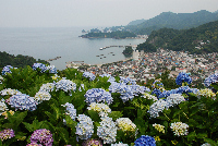 松崎町の中心を流れる那賀川沿い(しんしま橋から南郷橋)の約3kmの区間には、約3,000本のアジサイが植えられて、6月に入るとその花を咲かせます。
