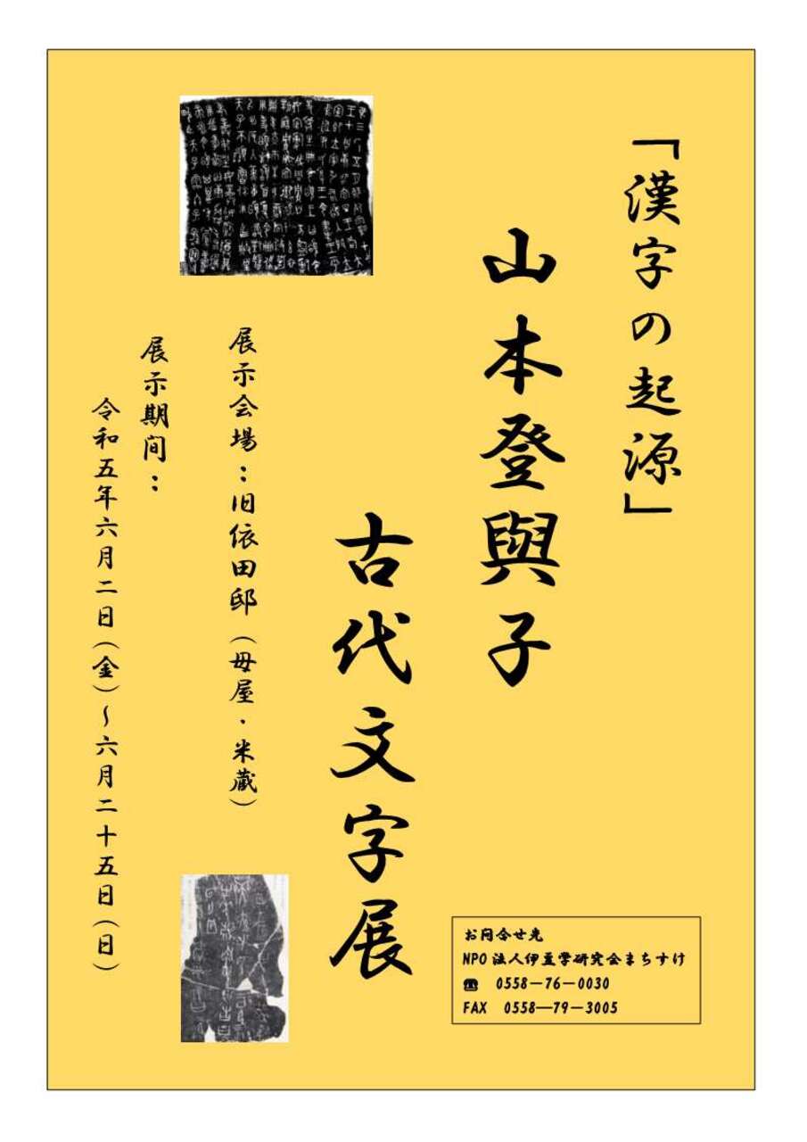 公開日 2023年06月02日 中国で始まる漢字のもととなった文字、亀甲や獣骨に刻まれた「甲骨文字」、その後に青銅器に刻まれた「金文」。 古代文字に魅了され独学で学ばれた、西伊豆町在住の山本登與子女史、ご自身が書き溜めた数々の作品を 「漢字の起源」山本登與子“古代文字展”として開催します。 展示期間 令和5年6月2日(金)~25日(日) 注)木曜日は休館日です。 場所 旧依田邸(母屋・米蔵)