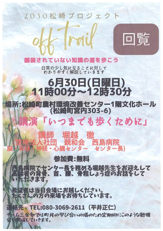 公開日 2024年05月29日 2030松崎プロジェクトのチーム三余塾では、町民の学び合いの場のために、定期的に勉強会を開催しています。 今回は、6月30日(日)に医療社団法人 親和会 西島病院の堀越徹 氏を講師に、講演「いつまでも歩くために」を開催します。 たくさんの方のご来場をお待ちしています。