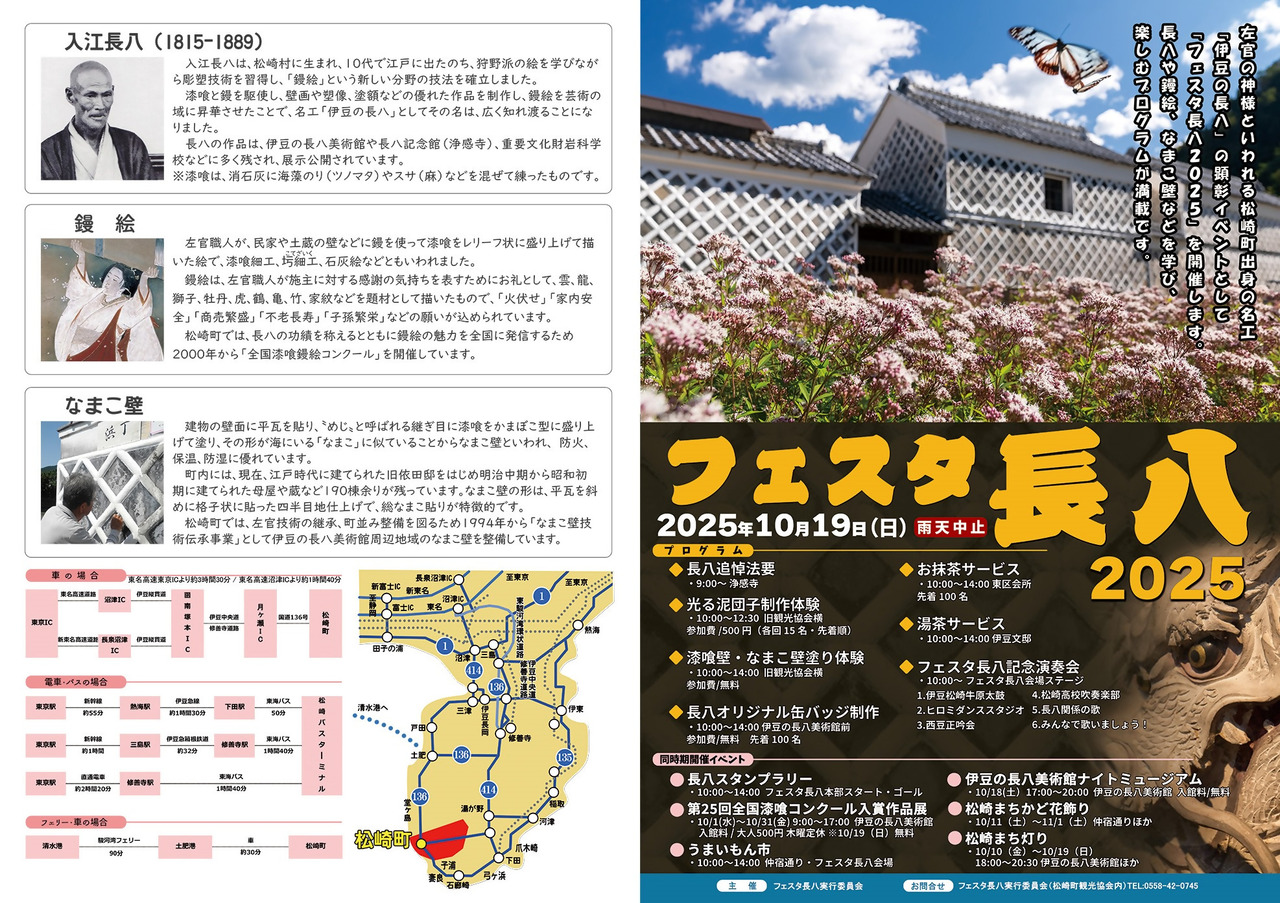 公開日 2025年09月30日 左官の神様といわれる松崎町出身の名工「伊豆の長八」の顕彰イベントとして、「フェスタ長八2025」を開催します。 開催日時:10月19日(日) 10:00~14:00 開催場所:長八美術館駐車場・仲宿通り周辺 開催内容:長八追悼法要・記念演奏会・うまいもん市 など ※雨天中止