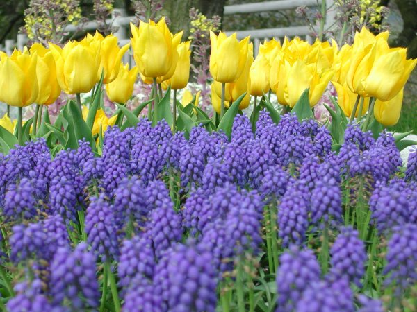 - 県道脇の花壇で、チューリップとムスカリが綺麗に咲いています。