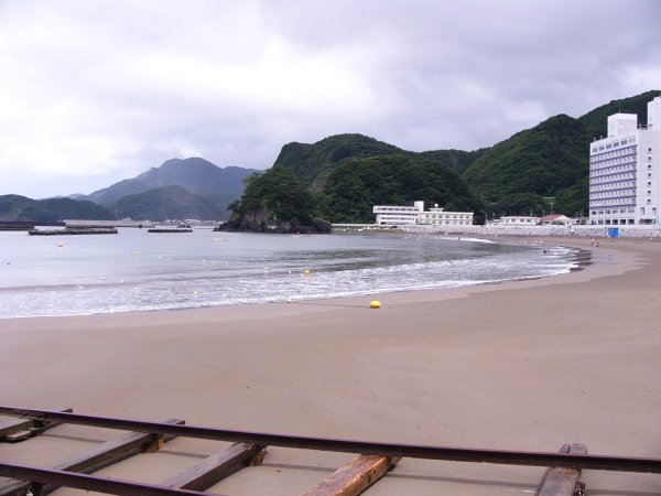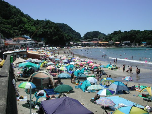 - 白い砂浜と青い海で有名な岩地海岸にも、たくさんの海水浴客が訪れていました。