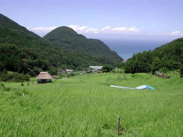 - 棚田には稲穂がつき始めました。 今年は寒く雨も多かったので、これから秋に向けて稲穂が頭をたれる姿が見られるか心配です。