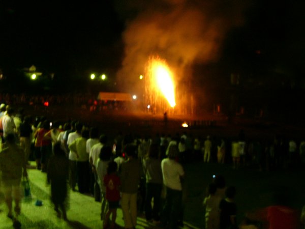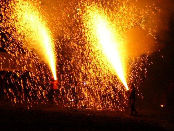 - 時々小雨の降る悪天候でしたが、約3,000人のお客様が見物に訪れました。やはり手筒花火の人気はすごかったです。
