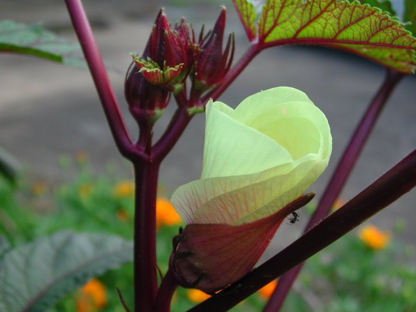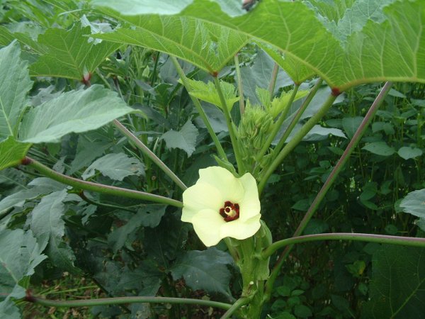 - 赤いオクラを見つけました。実だけでなく、茎まで赤いのですが、花は緑のオクラと同じく黄色でした。 クリックすると花が見られます。