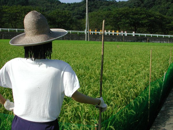 - 那賀より道売店近くの田んぼではすごくリアルなカカシが稲を見守っています。 後ろから見るとホントの人かと見間違う程です。 クリックするとカカシの後ろ姿が見られます。
