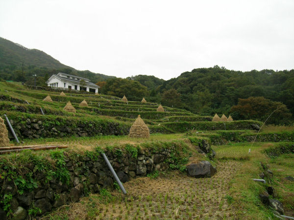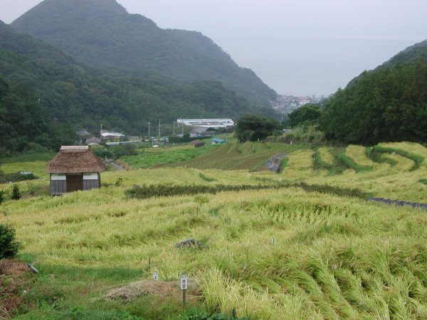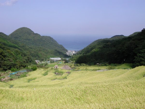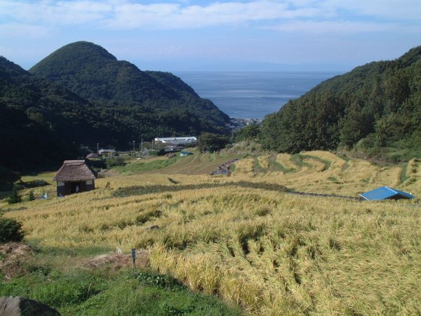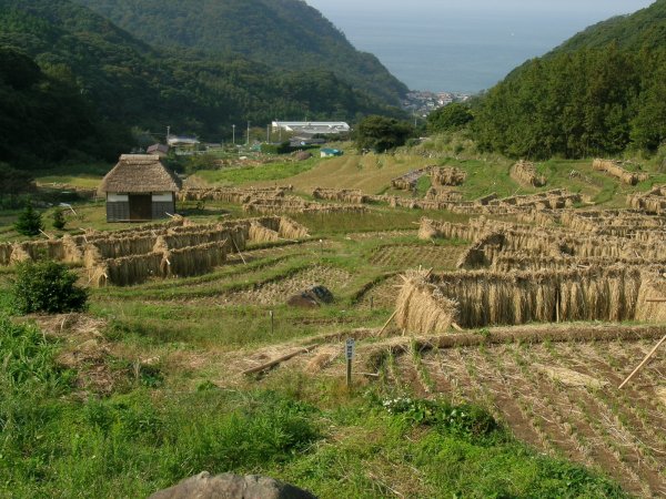 - 今日は快晴でした。風も強く吹き、海上も波がでていました。石部棚田に干してある稲もこの天気で乾きがよくなると思われます。