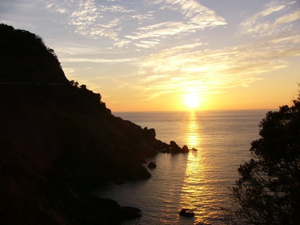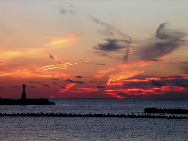 - 雲見から国道136号を少し松崎へ行ったところからの夕日です。烏帽子山や想い出岬の変化に富んだ海岸線と夕日がとてもきれいでした。 写真をクリックすると石部付近からの夕日を見ることができます。