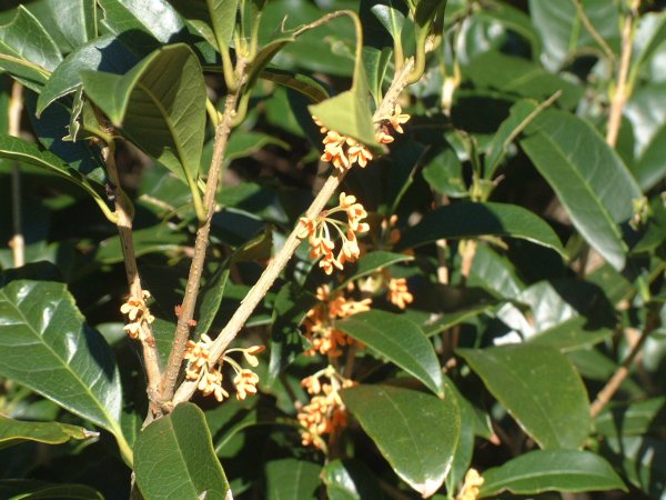 - 牛原山の芝生の広場に植栽されているキンモクセイに花が咲き始めました。木の周辺ではキンモクセイの甘い香りがしていました。