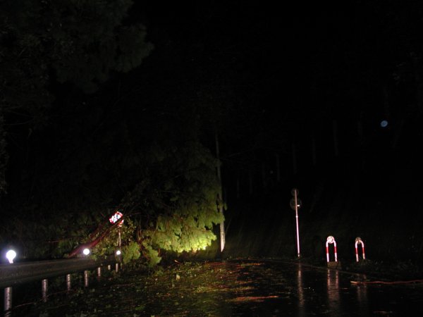 - 写真は、現場確認の様子です。(国道136号) 突風で多くの倒木があり、道をふさいでいます。 倉庫の屋根が風にあおられ、残骸が飛散している様子から、風の激しさがわかります。
