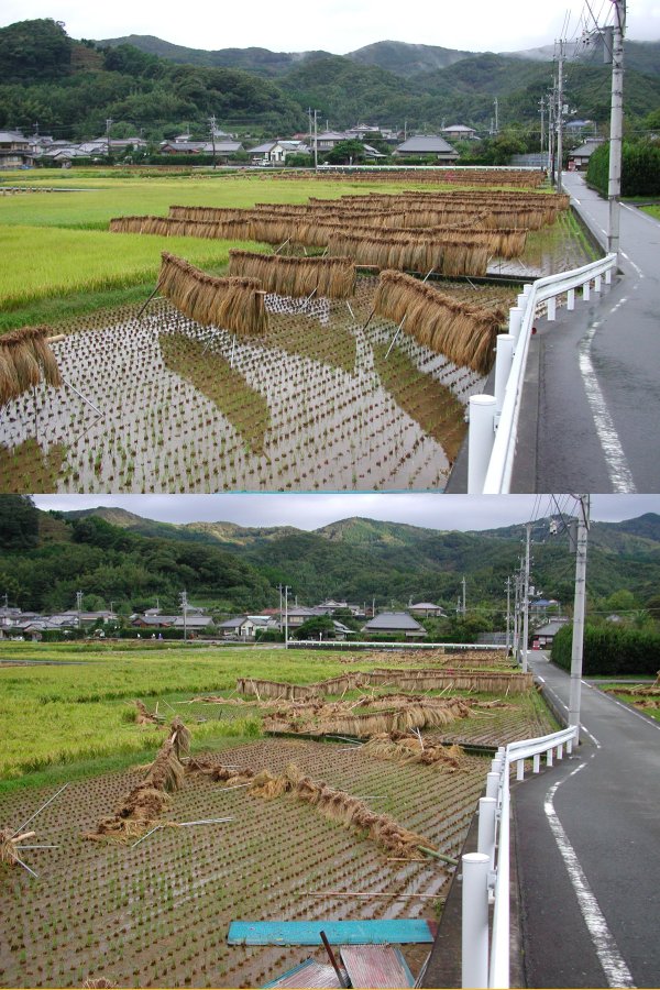 - 稲刈りの終わった田では、ウシに刈り取った稲を掛け乾燥させていました。 今回の台風で、多くのウシが倒れ稲も水浸しとなってしまいました。 写真をクリックすると、中耕地の昨日と今日の対比が見られます。