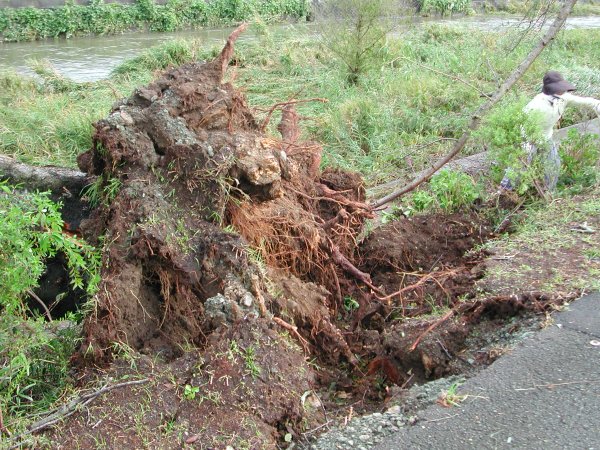 - 那賀川沿いの桜並木も被害を受けました。 一抱えはあろうかという大きな桜も、根こそぎ倒されているものがあります。 風の強さを思い知らされます。