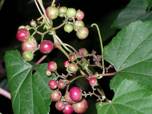 - 夏に小さな淡黄緑色の5弁の花を咲かせたつる性植物のノブドウ。果実は、これから 淡い紫色を経て空色に変わっていきます。