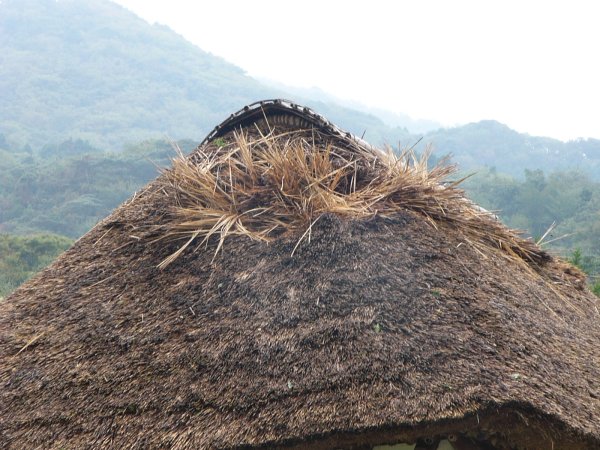- 石部棚田の水車小屋も被害を受けました。 屋根のカヤ葺きも風でこのとおりです。