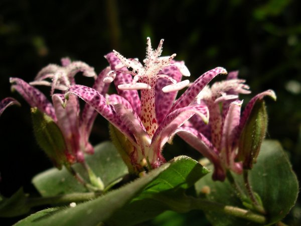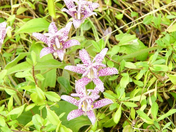 - 花びらに紫色の斑紋のあるホトトギスの花が里山できれいに咲き、小鳥(ほととぎす)の胸の斑紋とにていることや神秘的な造形の美しさに目を奪われてしまいます。