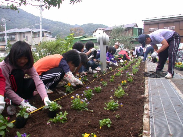 - 三聖塾とみどりの少年団では、ボランティア活動として、十字の園花壇の花の植え替えを行いました。