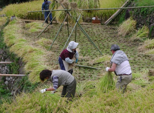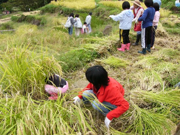 - 今日も石部棚田では、稲刈りが行われています。 大人も子供も額に汗をいっぱいかき、稲と格闘しています。