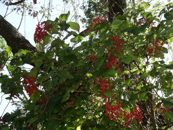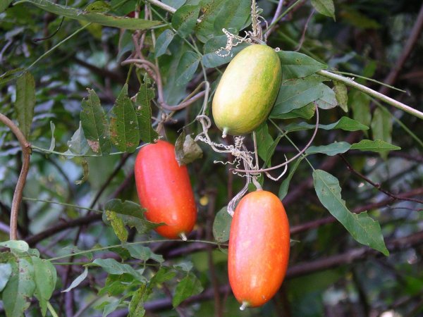 - 夏の夕方に、花弁の先端が細い糸状の花を咲かせたカラスウリは、秋になり赤く熟した実を付けています。