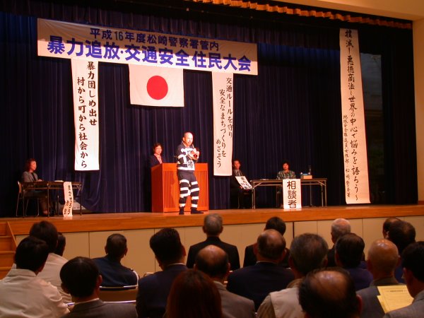- 松崎町環境改善センター文化ホールでは、平成16年度松崎警察所管内暴力追放交通安全住民大会が開催されました。 大会は、県警音楽隊の演奏とカラーガード隊ピュアエンジェルスの踊りで幕を開け、町内小中学校児童の作文発表や寸劇などを通じ暴力追放・交通安全意識の高揚を
