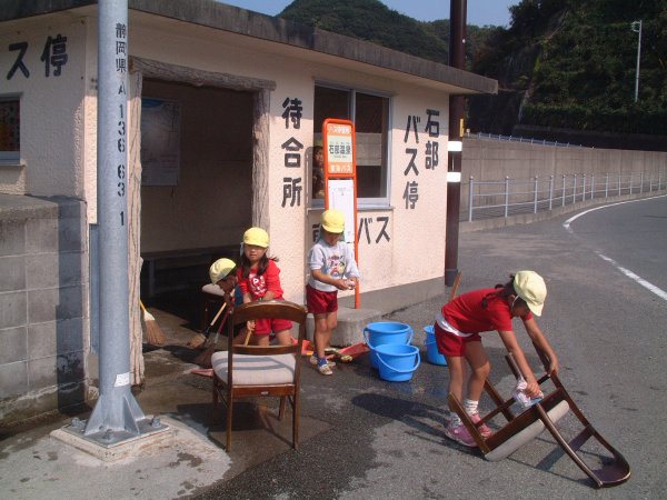 - 三浦幼稚園児が、石部バス停の看板・椅子を拭いたり、すみずみまで清掃しました。