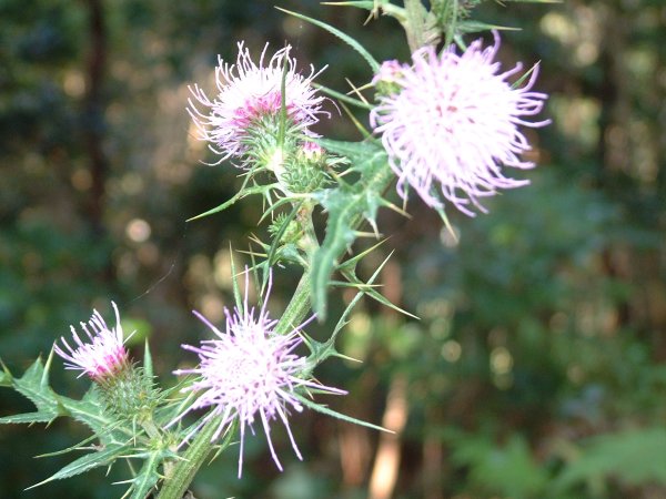 - 山の中にノアザミが咲いていました。さわると、とても痛そうな程花も葉も尖っています。