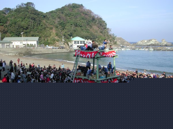 - 雲見乗り初め。 漁船のパレードの後、海岸に設置されたやぐらの上から餅がまかれました。
