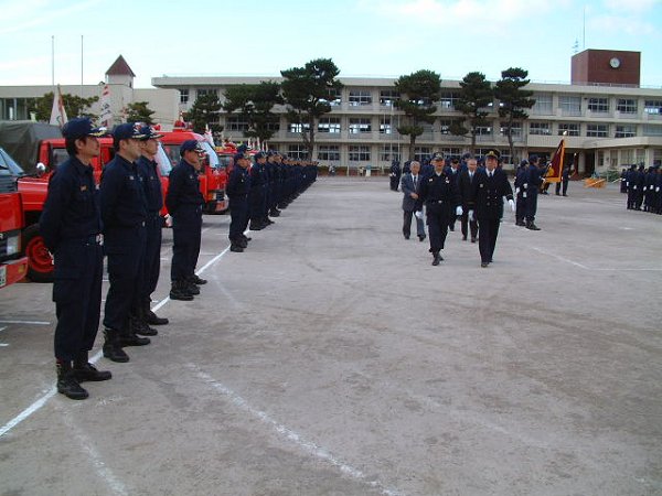 - 松崎小学校グランドで、松崎町消防団出初め式が行われました。 式典ではポンプ繰方が披露されました。 式典終了後、町内をパレードし宮の前橋下流で放水が行われました。