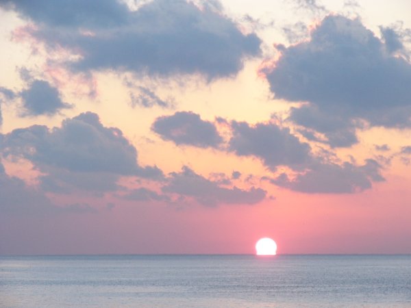 - 今日は、水平線に雲も無く、海に沈む夕日を見ることができました。