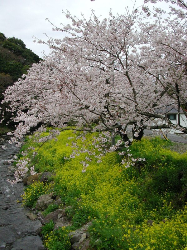 - 川沿いの土手にはスイセンや菜の花が咲いています。 写真は岩科川(重文岩科学校近く)の様子です。