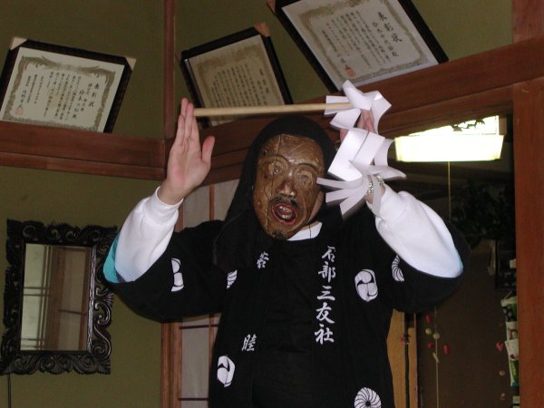 - 石部では昨日からお祭りが行われています。 昨日は太鼓台が区内を練り歩きました。 今日は、獅子などの面を着け区内各戸を回って「悪魔払い」を行いました。