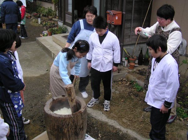 - 中川小学校の5年生が稲作体験で収穫したもち米で餅つきを行いました。