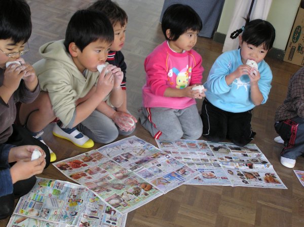 - 今日は、岩科幼稚園の園児と地域の方々で餅つきが行なわれました。園児はつきたてのお餅をおいしそうに食べていました。