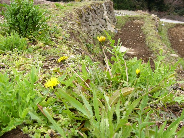 - 石部の棚田ではたんぽぽやレンゲが咲いています。