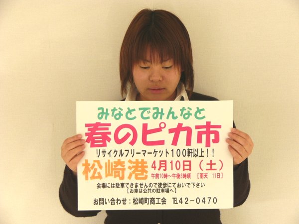 - 4月10日に開催される春のピカイチのポスターが商工会より届きました。当日は松崎港にて100店以上のフリーマーケット出店者で賑わいます。