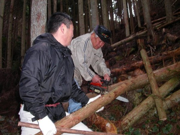- 地域おこしのかいでは、桜やワイルドフラワーの時期を迎えるにあたり、那賀大規模花畑足湯用に昨年の秋に切ってあった、竹を加工し準備を行いました。 割った竹は腰掛け部分と囲いに使用する予定です。 クリックすると、足湯の腰掛け部分を支える支柱に使用するため、丸太