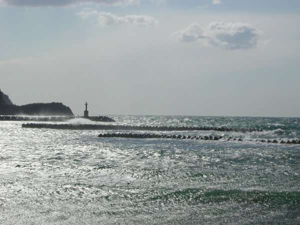- 今日は強い西風が吹いています。 海は大きな波形って、海岸線は塩が風に乗って雨のように降ってきます。