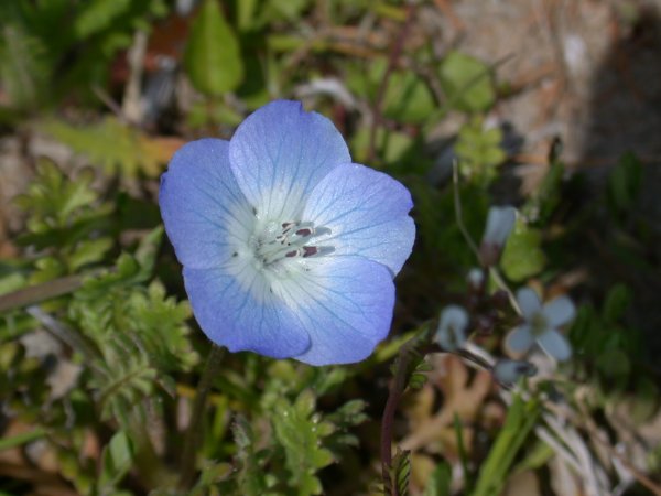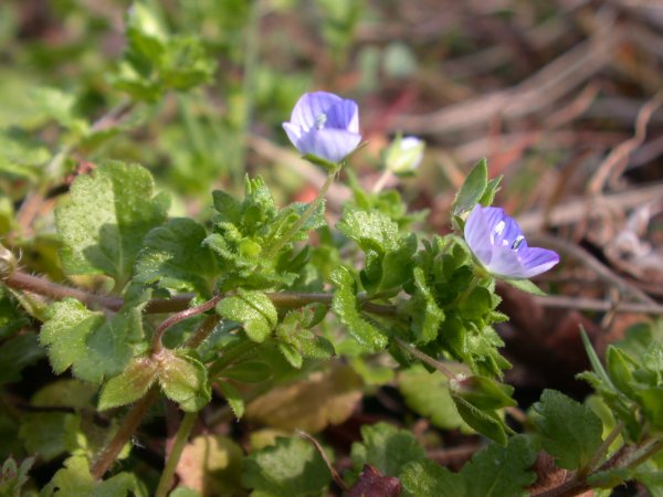 - 松崎町内の道路敷などでは、オオイヌノフグリという小さな草花が咲いています。直径1cmほどの花なので、ゆっくり歩かないと発見できません。