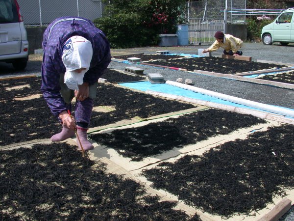 - 石部地区では、ひじき狩りが行われ、収穫したひじきを一斉に干していました。 広げたひじきを箸で返したり石を取り除いたり、かなり細かい作業が行われていました。