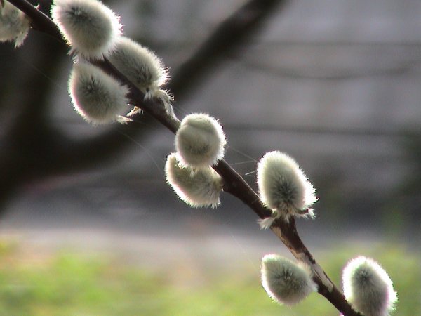 - 沢沿いを注意深く見ていると、ネコヤナギが銀白色の花穂をつけているのを見つけます。