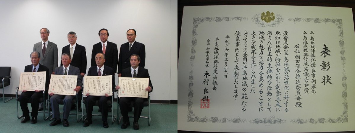 - 昨日の話題になりますが、石部棚田が、平成15年度半島地域活性化優良事例表彰で、「半島地域振興対策協議会長賞」を受賞(4賞のうちの2番目)しました。 都市と農山漁村の交流に「石部棚田オーナー制度」の功績が認められ、石部棚田保全推進委員会(会長 高橋周蔵)が表彰