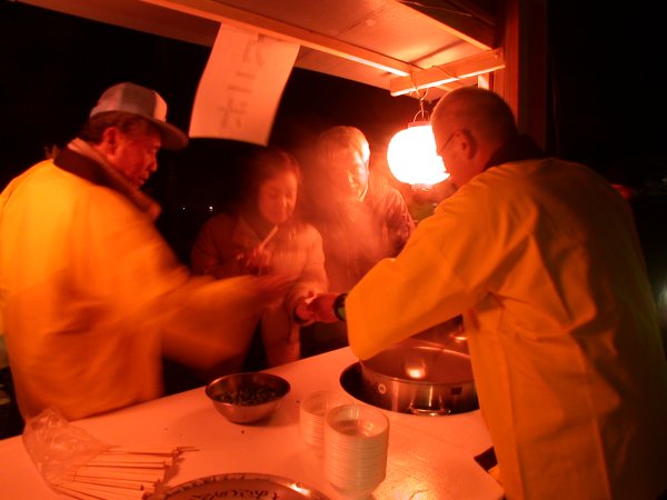 - 地域おこしの会では、那賀バイパス桜ライトアップにあわせ、山菜汁・かに汁・オリーブ茶の無料サービスを行いました。