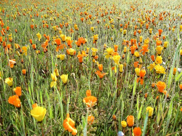 - 今日は風も無く暖かったので、先週末に開花宣言した那賀の「田んぼをつかった花畑」では、多くのアフリカキンセンカが開花しました。