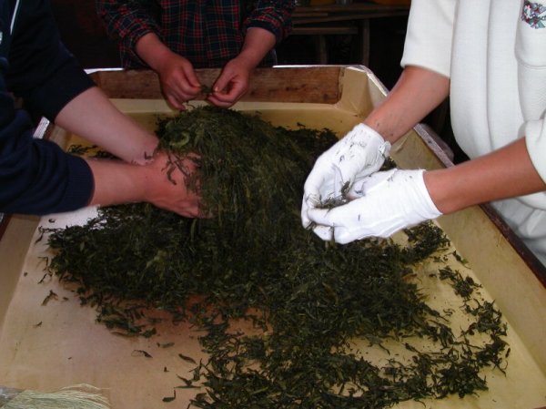 - 早朝から焙炉でお茶揉みをやっています。 今日は4焙炉(ホイロ)分やります。5焙炉生葉で5㎏になり、仕上がりで0.4kg(約1/3)になります。 天候が悪く、乾きが悪く時間がかかっています。