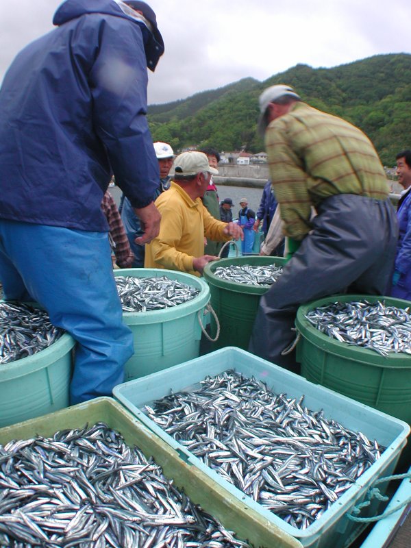 - キビナゴの水揚げは、海の上も大変でしたが、陸ではもっと大変。 船から桶に積み替えるのが大変です。