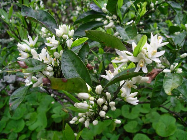 - ミカンの花が咲いています。 白い花が、緑の葉のバックにっきりと浮かび上がっています。