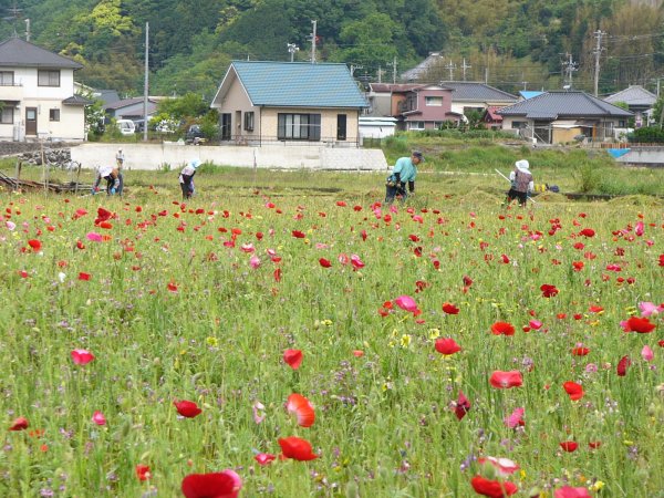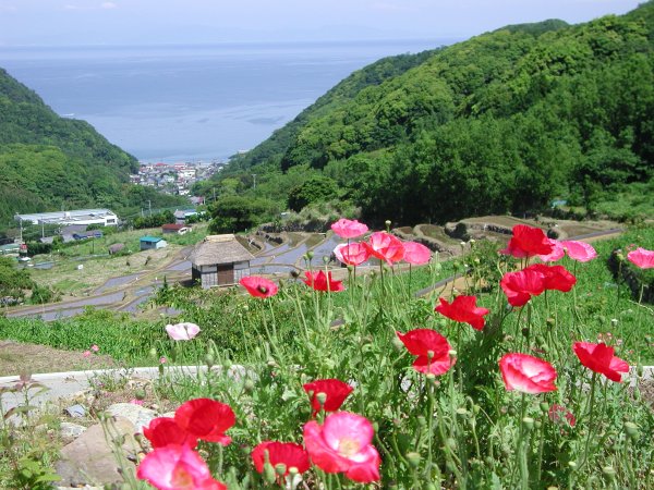 - 石部棚田では、ポピーがきれいに咲いています。 田などの風景ととけあって、とてもきれいです。