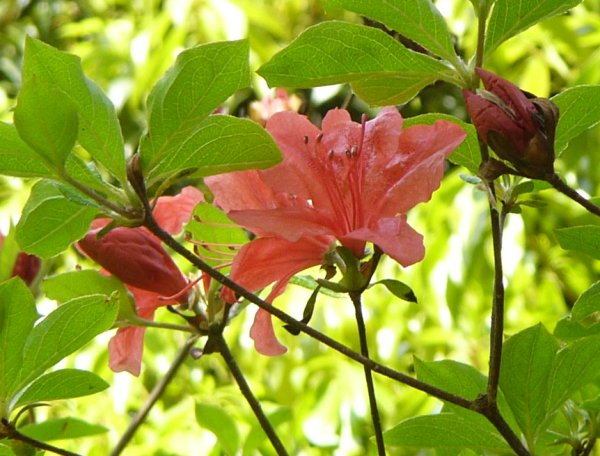 - 池代〜八瀬峠付近では、ツツジが開花してきました。朱赤色の花は、周囲の新緑に映えきれいでした。