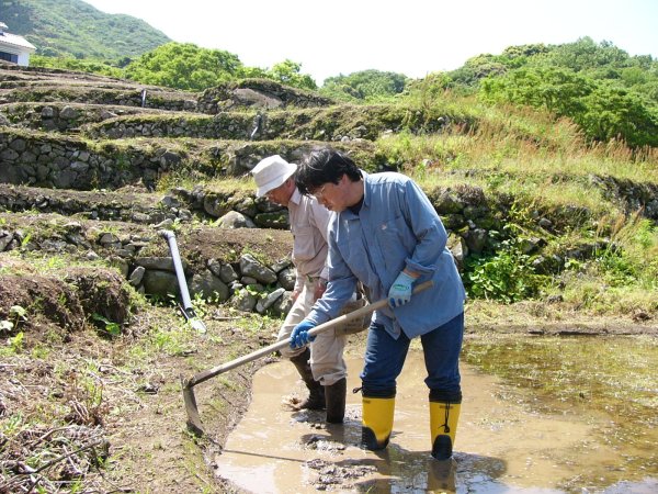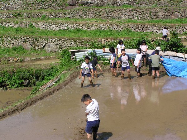 - 棚田では、三浦小学校の児童がしろかきの作業を手伝っていました。棚田では、明日棚田では田植え祭が行なわれます。