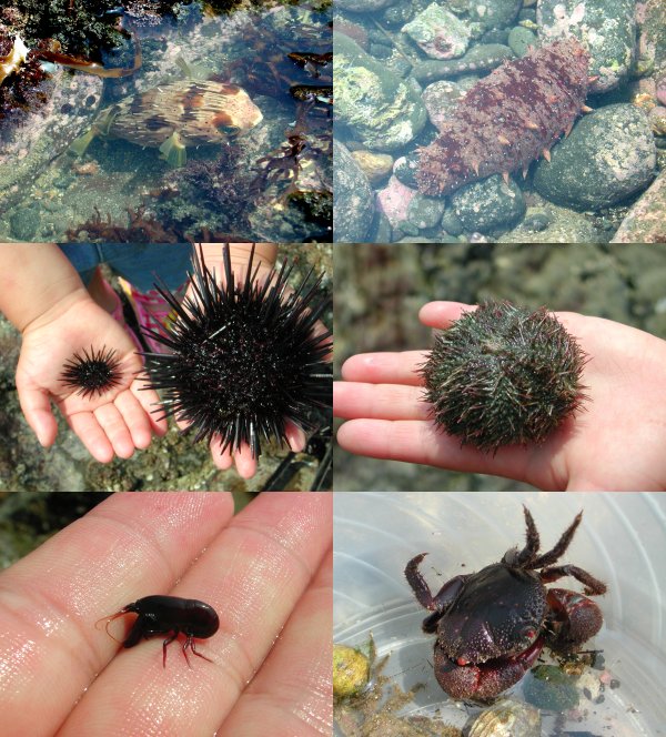 - 引き潮にあわせ海に行くと、いろいろな磯の生き物に出会えます。 この写真はかにばかりですが、クリックすると潮だまりに残されたハリセンボンやなまこ・ムラサキウニ・バフンウニなどが見られます。