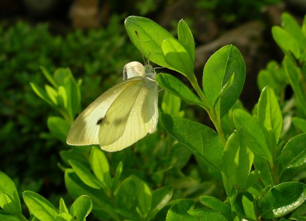 - 里山のツツジの若葉に「モンシロチョウ」が、羽を休めていました。これからの季節、吸蜜行動などで頻繁に観察できます。